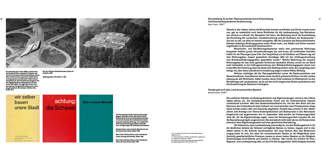 1955 veröffentlichten Max Frisch, Lucius Burckhardt und Markus Kutter das Plädoyer achtung: die Schweiz, um vor der zunehmenden Zersiedelung der Schweizer Landschaft zu warnen und eine neue und kontrolliertere Urbanität in Form von verdichteten Siedlungen zu fordern.