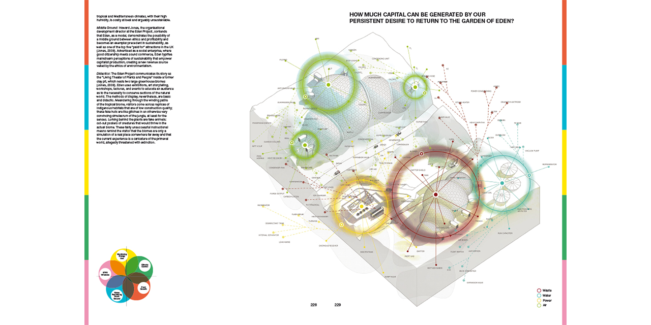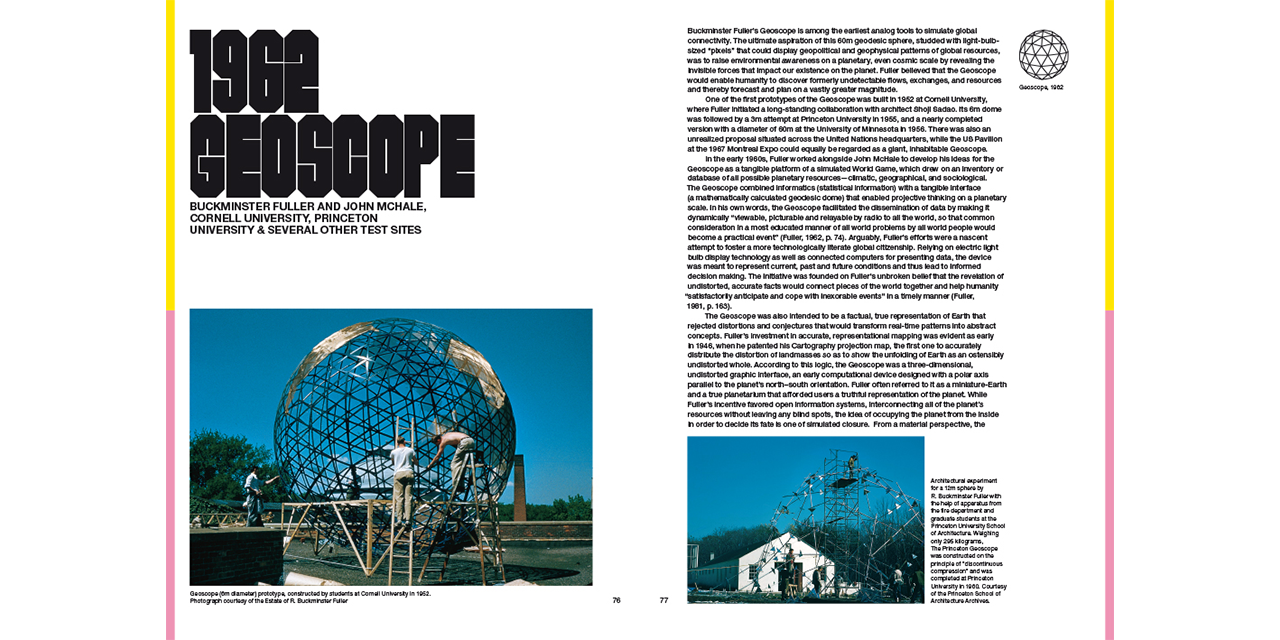 In The Architecture of Closed Worlds prototypes are presented through unique discursive narratives with historical images. Each includes new analysis in the form of a feedback drawing that problematizes the language of environmental representation by illustrating loss, derailment, and the production of new substances and atmospheres.
