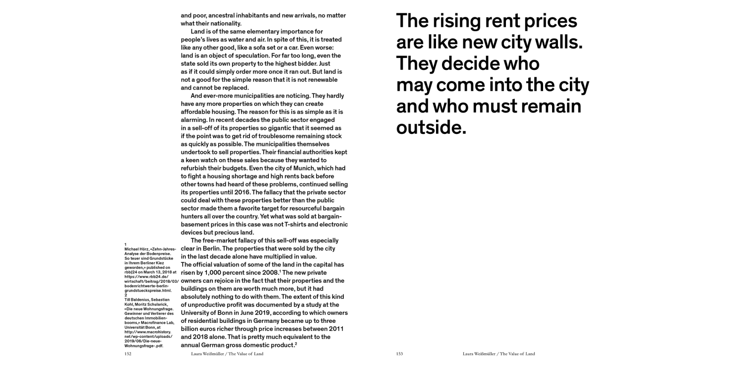 How we deal with land has far-reaching implications for architecture and urban development. The last decade has seen a dramatic rise in the privatization of urban land and in speculation. Many European cities that today find themselves under extreme development pressure have virtually no land left to build on. In view of the acute housing shortage, the issue of who owns the land is therefore more relevant than ever: To what extent are we able to treat the land as a common good and guard it from the excesses of capitalism?