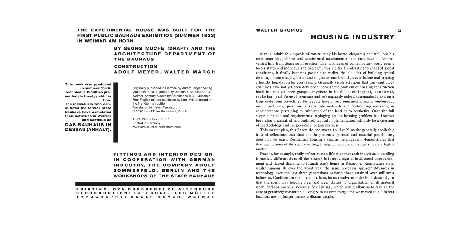 The book about the project was compiled in the summer of 1924 and became the third volume of the Bauhausbücher. Following an essay by Walter Gropius that supplies information on the “Housing Industry,” Georg Muche presents the design of the model building. Adolf Meyer then describes its technical execution, giving details on the companies involved.