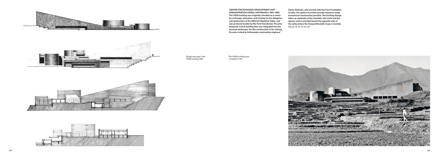 Carl Pruscha is an unusual architect. His works are found in New York, Kathmandu, and Vienna. Far removed from each other, these three geographical areas profoundly influenced his outlook and career. In the United States Pruscha planned visionary and utopian projects. He began to deal with the real world in Nepal where the UN had sent him as a consultant in 1964. In this foreign culture the young architect grew with the challenge. Aside from complex development proposals for the Kathmandu Valley he created remarkable buildings that blend tradition and Modernism in close harmony with their natural and landscape environment.