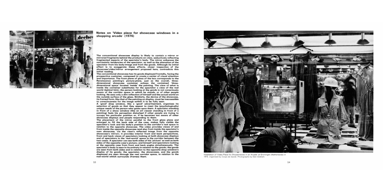 The publication represents an important document in Dan Graham’s artistic examination of the video medium. Graham’s installations and performances with video from the years 1970–78 are documented with numerous illustrations, photos, and brief descriptions. In addition, the volume contains an essay by the artist in which he examines the various possibilities and forms of representation offered by the video medium, and draws the boundaries between these and representational spaces in television, film, or architecture. The book also offers contributions by Michael Asher and Dara Birnbaum, as well as an annex with a biography and bibliography.