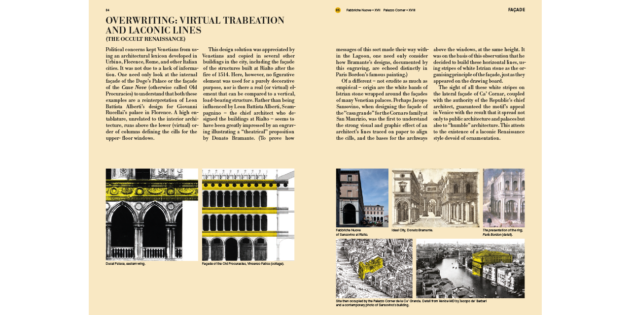 Developed as a parallel research project of Fundamentals—the exhibition at the 14th Venice Architecture Biennale curated by Rem Koolhaas—the book offers insights on Venetian façades, stairs, corridors, floors, ramps, ceilings, doors, hearths, windows, balconies and walls. “Product not [only] of the mind but of societal organization” the elements are isolated from their picture-perfect context and from the postcard view of Venice that is impressed in our retinas, introducing the reader—through a combination of collages, drawings, photographs, paintings, film stills and quotes—to a radically new way of seeing Venice. Like a camera obscura photograph cuts through the often irrelevant embellishments of architecture to reveal the underlying skeleton of a building (i.e. its elements), this guide will allow the reader to better understand the fundamental transformations that have shaped Venice during the past ten centuries. This city, which for many is—architecturally speaking—permanently frozen in time, has in fact often been at the forefront of challenging the architectural conventions and underwent an unprecedented urban transformation.