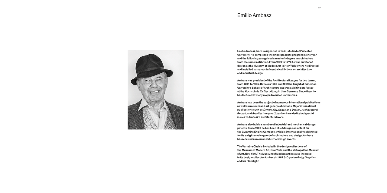 Emilio Ambasz (*1943 in Argentina) studied at Princeton University where he completed the undergraduate program in one year and gained a master’s degree in architecture just a year later. From 1969 to 1976, he was curator of design at the Museum of Modern Art in New York, where he directed and installed exhibitions on architecture and industrial design. Ambasz was president of the Architectural League for two terms, from 1981 to 1985. Between 1966 and 1969, he taught at Princeton University’s School of Architecture and was a visiting professor at the Hochschule für Gestaltung in Ulm, Germany. Since then, he has lectured at many major American universities. Ambasz holds a number of industrial and mechanical design patents and has received numerous industrial design awards.