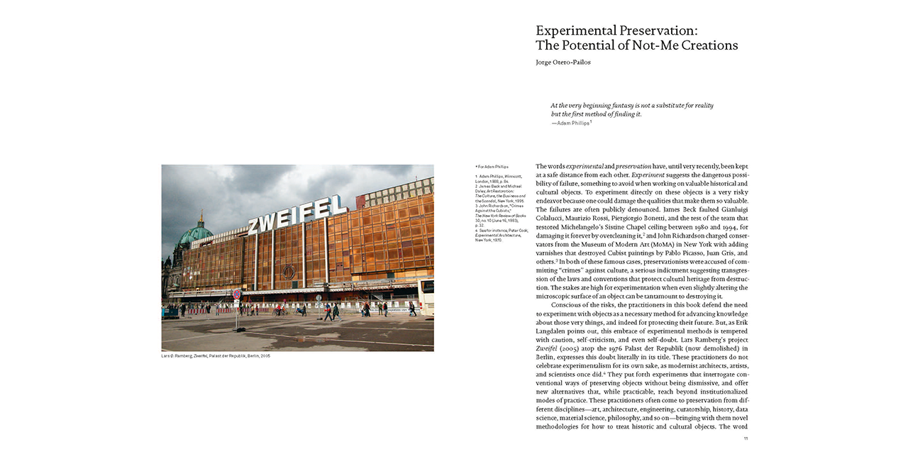 Old things, historic things, smelly dirty things, all the things that were considered the very opposite of “contemporary,” have suddenly irrupted forcefully into architecture and art, blurring their boundaries. This book takes stock of the emerging generation behind this turn, and examines their experimental engagements with the preservation of culturally charged objects. Structured around a series of interdisciplinary dialogues among practitioners and thinkers, and illustrated with recent projects, the book provides a window into the unfolding intellectual frameworks, aesthetic modes, cultural ambitions, and political commitments that are the basis of experimental preservation.