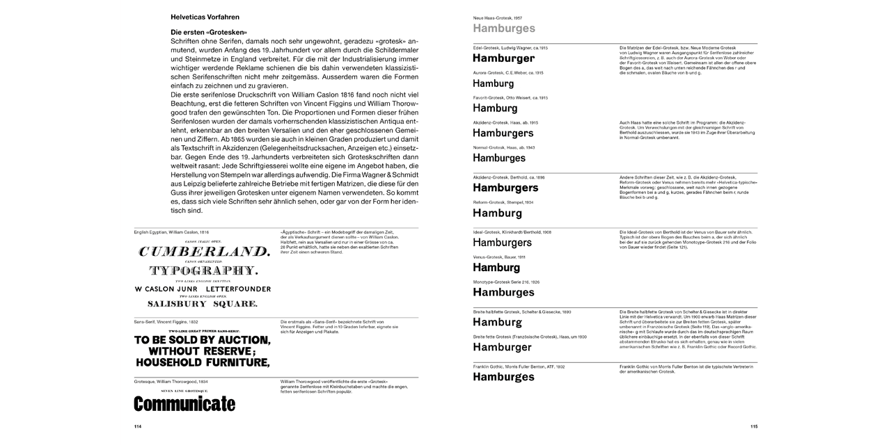 Die Publikation zeichnet die fünfzigjährige Geschichte der Helvetica nach, vergleicht sie mit den bekannten Groteskschriften des 20. Jahrhunderts und untersucht das Phänomen ihrer beispiellosen Verbreitung. Zahlreiche Abbildungen präsentieren eine Vielzahl von Anwendungen der Schrift über fünf Jahrzehnte und aus verschiedenen Anwendungsgebieten – von der Signaletik bis zum Partyflyer.