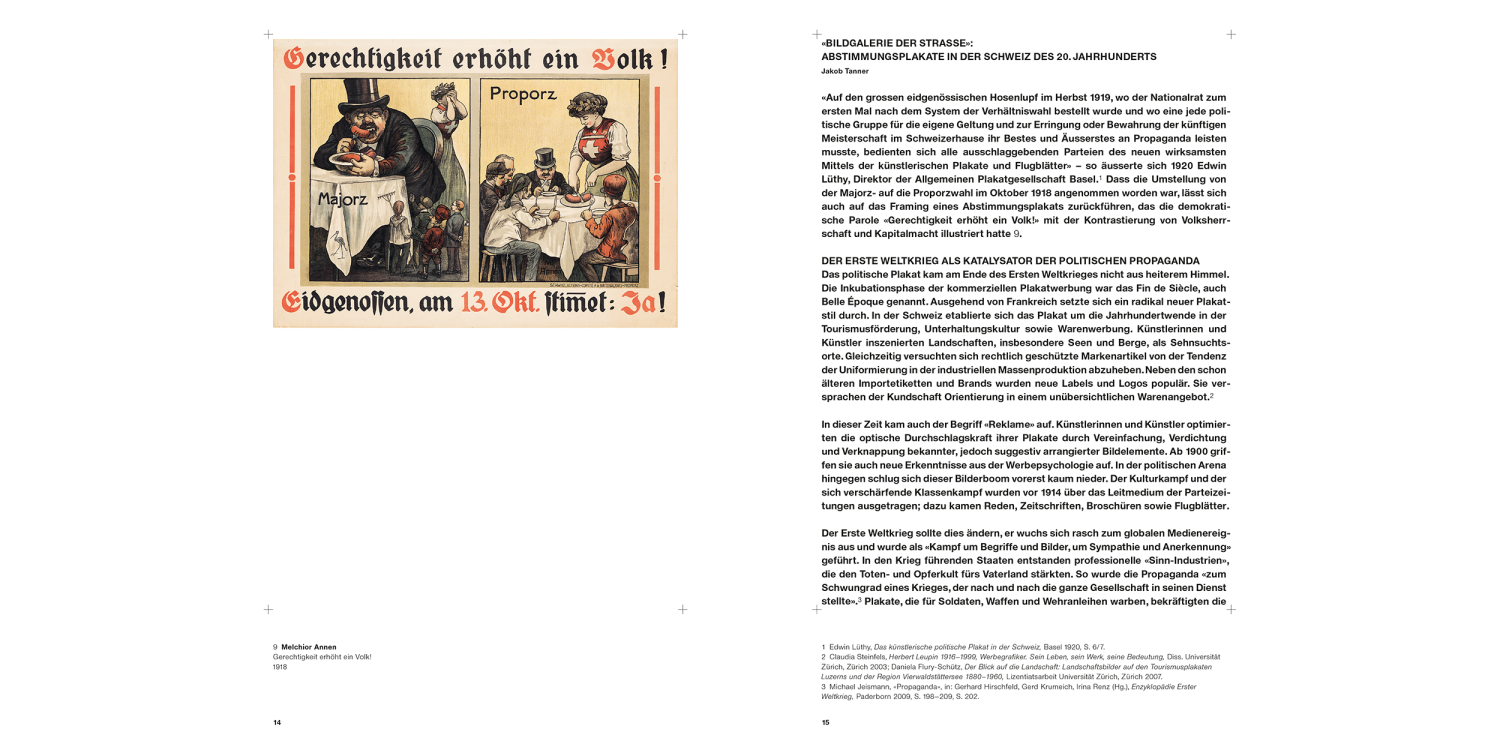 The Swiss population is called upon to participate actively in political decision-making processes through regular campaigns. These campaigns are often concerned with issues that stir up heated emotions and lead to ideological battles. Campaign posters, which have influenced opinion-making since the beginning of the 20th century, bear testimony to direct democracy. This special form of political propaganda – prominently associated with Switzerland – is a sensitive indicator of socio-political moods and reflects both national mentalities and global tendencies.
