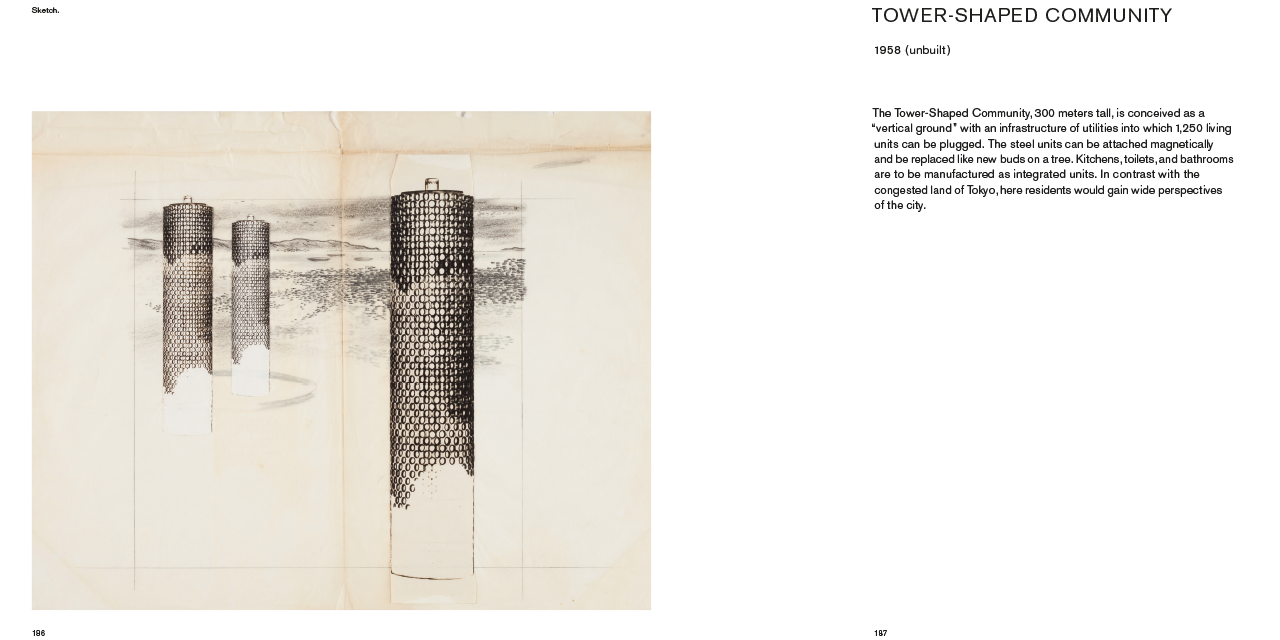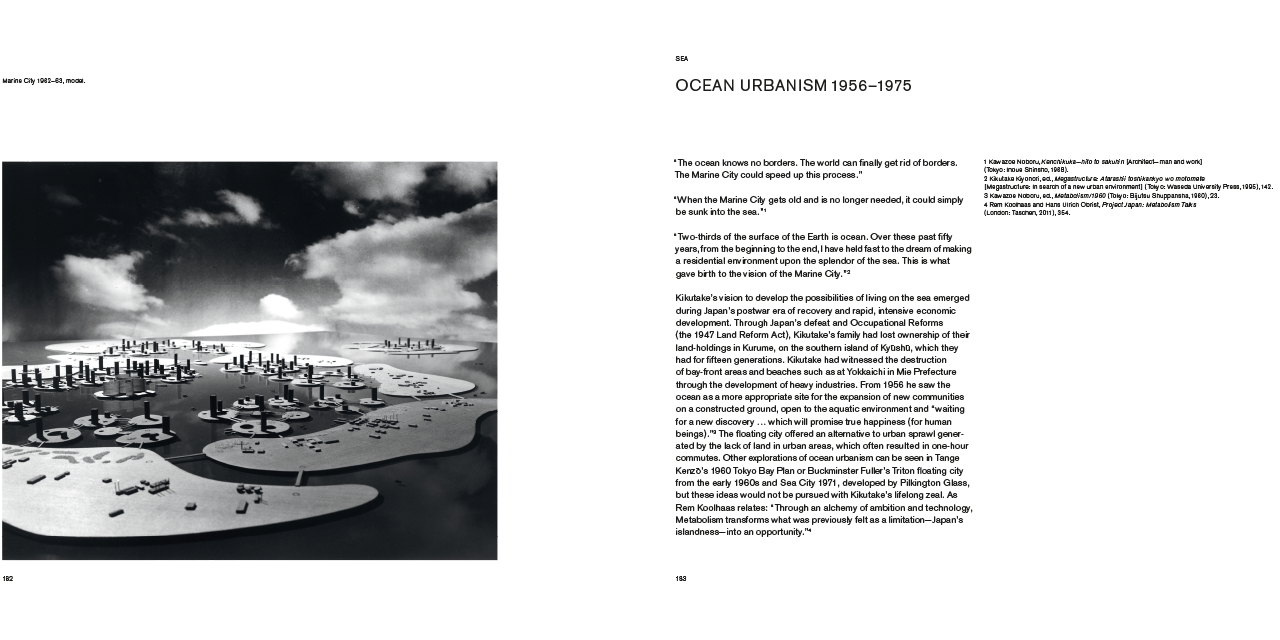 The publication documents some of the architect’s pivotal works, spanning the late 1950s to today – including the Sky House, Hotel Tōkōen, the Izumo Administration Building and the ongoing Marine/Ocean City project. Abundantly illustrated with archival drawings and period and contemporary photographs, Between Land and Sea provides compelling perspectives on the practices, discourses and production contexts of Kikutake’s work as well as the architecture and urbanism of postwar Japan.