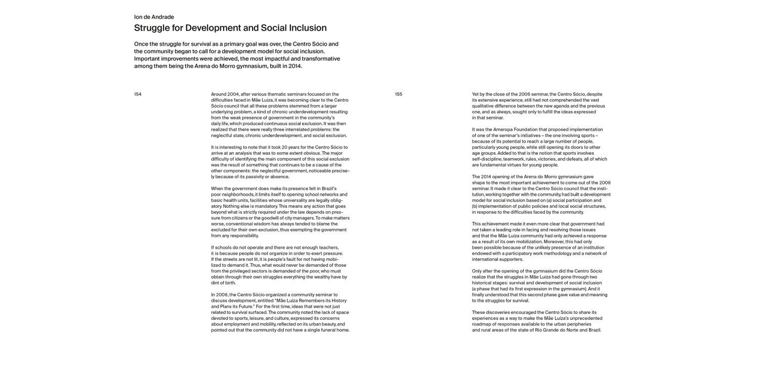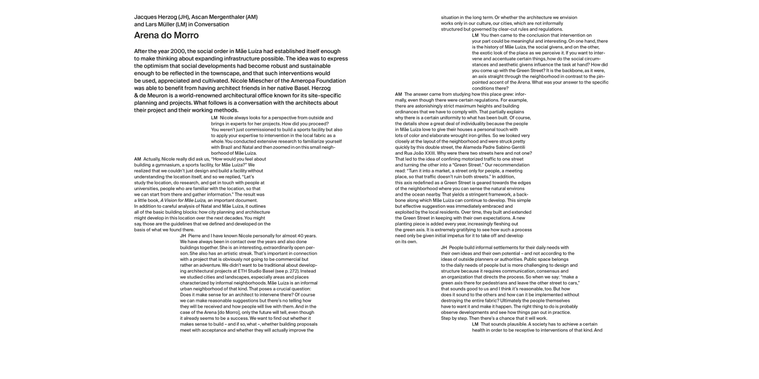 Over the past 30 years, the district of Mãe Luíza in Brazil's northeastern city of Natal developed from a desolate favela into a functioning community. From the first humanitarian aid to construction of a gymnasium, this persistent process is outlined in short articles and essays in the second part of this richly illustrated volume. The documentation impressively demonstrates how transformation was achieved step by step with the help of many, laying the groundwork for ongoing progress. Less crime, better education, and a fairer society – much has been accomplished and even more is possible for the future.