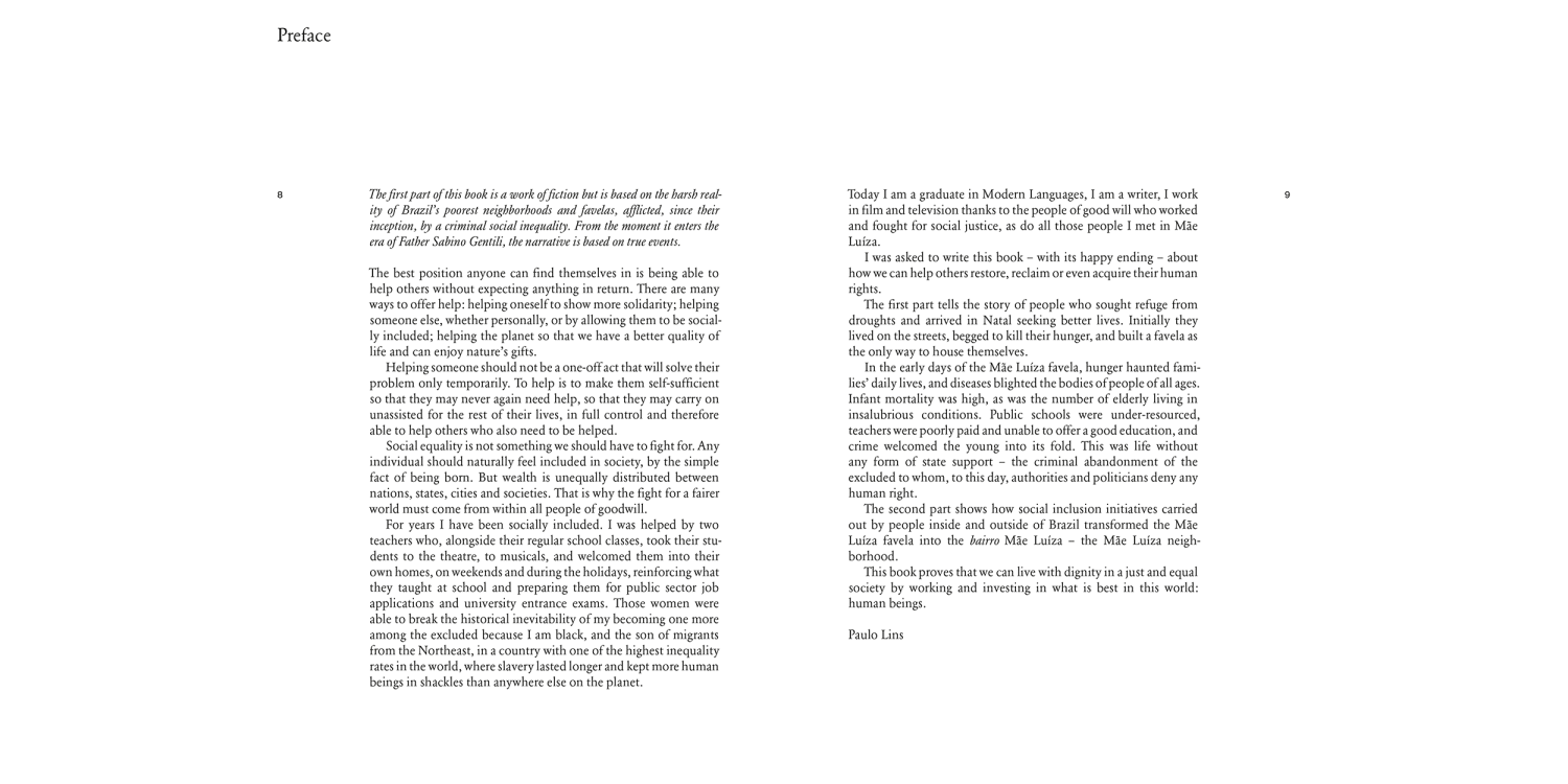 A story by bestselling author Paulo Lins (“City of God”) tells the stirring tale of the establishment of the Brazilian favela Mãe Luíza. Fleeing drought and deadly heat, the people there fought for a piece of land to call their own, hoping for a better life. Thanks to their optimism and solidarity, their vision gradually took shape.