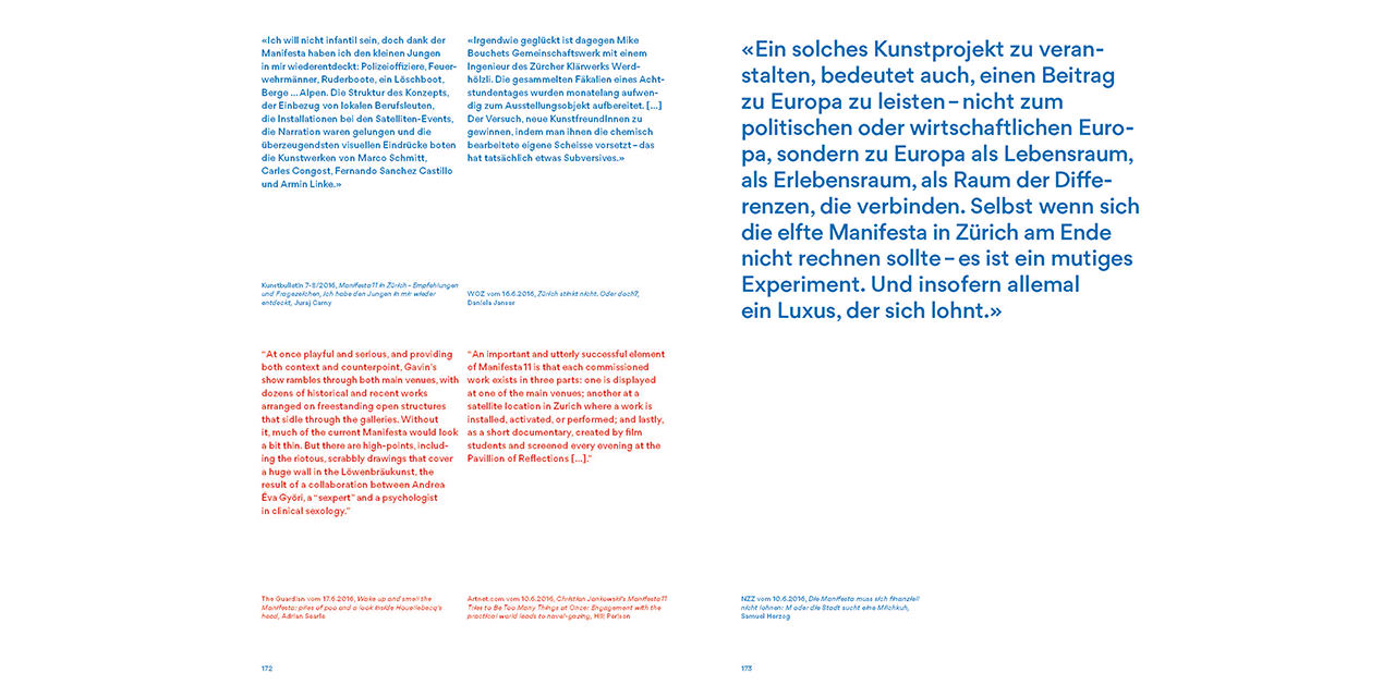 The book Manifesta 11 in Zürich documents the collective art experiment Manifesta 11, which took over the city of Zurich in the summer of 2016, and acts as a collection of memories. For the first time the European biennial not only offered a platform to established artists and institutions but served as a melting pot and unconventional meeting point for art professionals and the public alike by enabling inspiring encounters through creating informal venues.