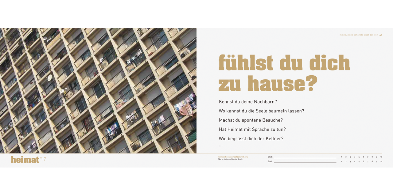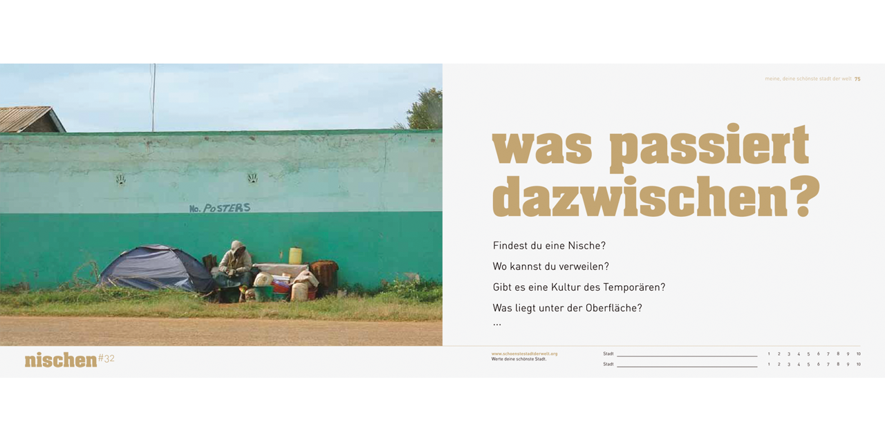 Bald werden mehr als zwei Drittel aller Menschen in Städten leben und die Zahl der immer mobiler werdenden Menschen, die mühelos zwischen den Metropolen pendeln, wächst kontinuierlich. Verschiedene Städterankings wählen jährlich weltweit die «Top Ten» der Städte. Aber was macht eine Stadt wirklich lebenswert? Auf diese Frage geben die Rankings nur unzureichend Antwort. Ihre ökonomisch ausgerichteten, quantitativen Kriterien sind oft aus dem Kontext gerissen und erscheinen als die einzig ausschlaggebenden, allgemein erwünschten Lebensqualitäten der Stadt. Persönliche Erfahrungen sind aber vielschichtiger.