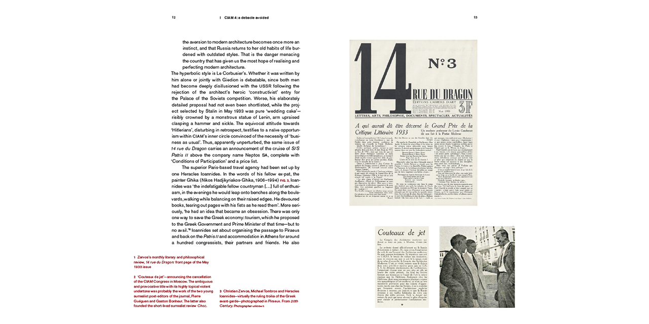 Together with a close study of Le Corbusier's sketches and notes in his carnet B5, all of these documents (and even more)—compiled by the authors with utmost care—reveal the preoccupations of the key personae including Sigfried Giedion, Fernand Léger, Amédée Ozenfant, Cornelis van Eesteren, Otto Neurath, and Le Corbusier himself, enabling a reconstruction of their epiphanies, discussions and estrangements at this critical moment in history. They give away a lot about the vital contribution to 20th century culture made by members of the Greek artistic community in Paris, such as Christian Zervos, publisher of Cahiers d'Art; Tériade, editor of the surrealist review Minotaure and publisher of Picasso; Michael Tombros, sculptor and publisher of 20th Century; and the painter Ghika.
