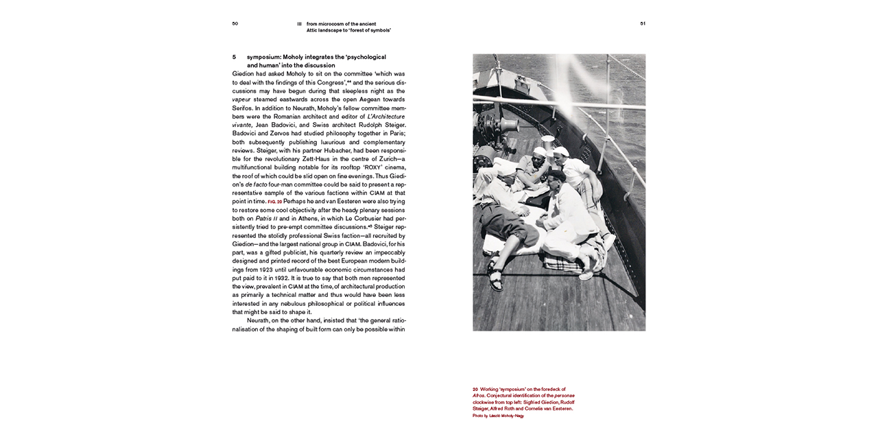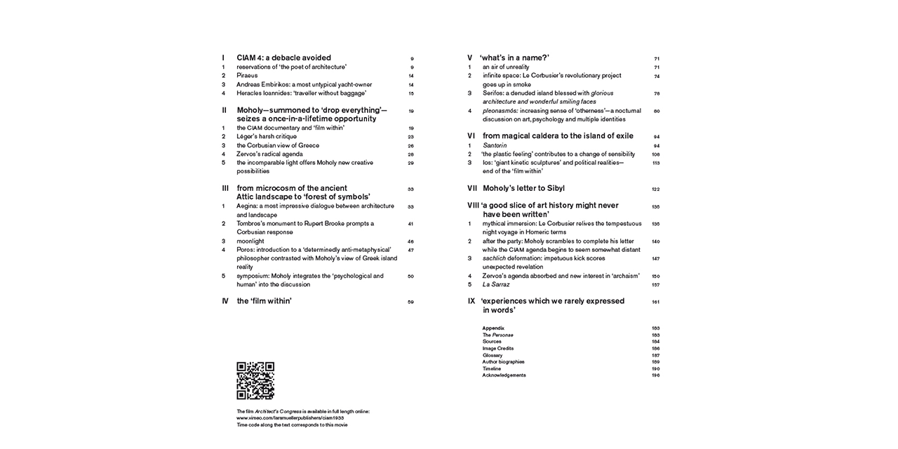 The book concerns the four-day cruise to the Aegean islands made by the "inner circle" of the International Congress of Modern Architecture (CIAM) and their friends during the 4th congress in August 1933. Structured around that sequence of Moholy-Nagy's film Architects' Congress dealing with the cruise, the book sheds light on this legendary event in the history of the European architectural and artistic avant-garde.