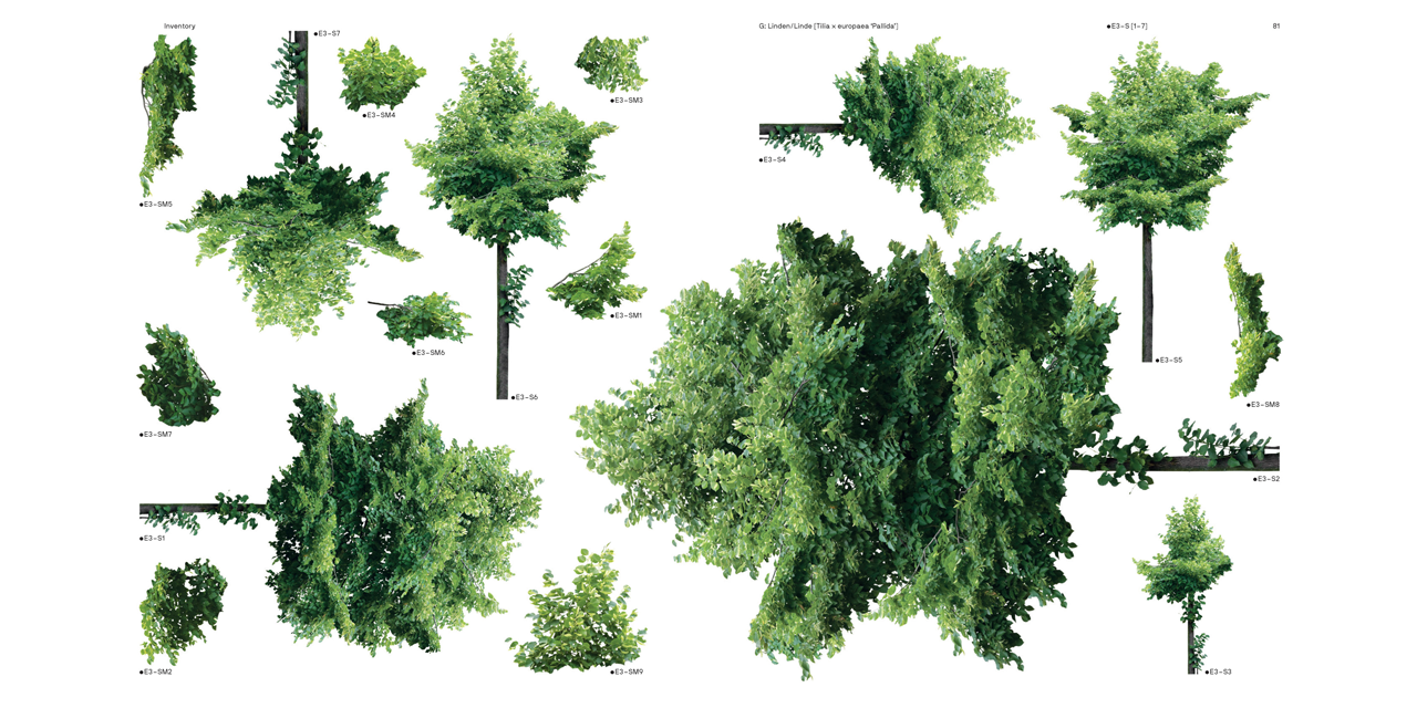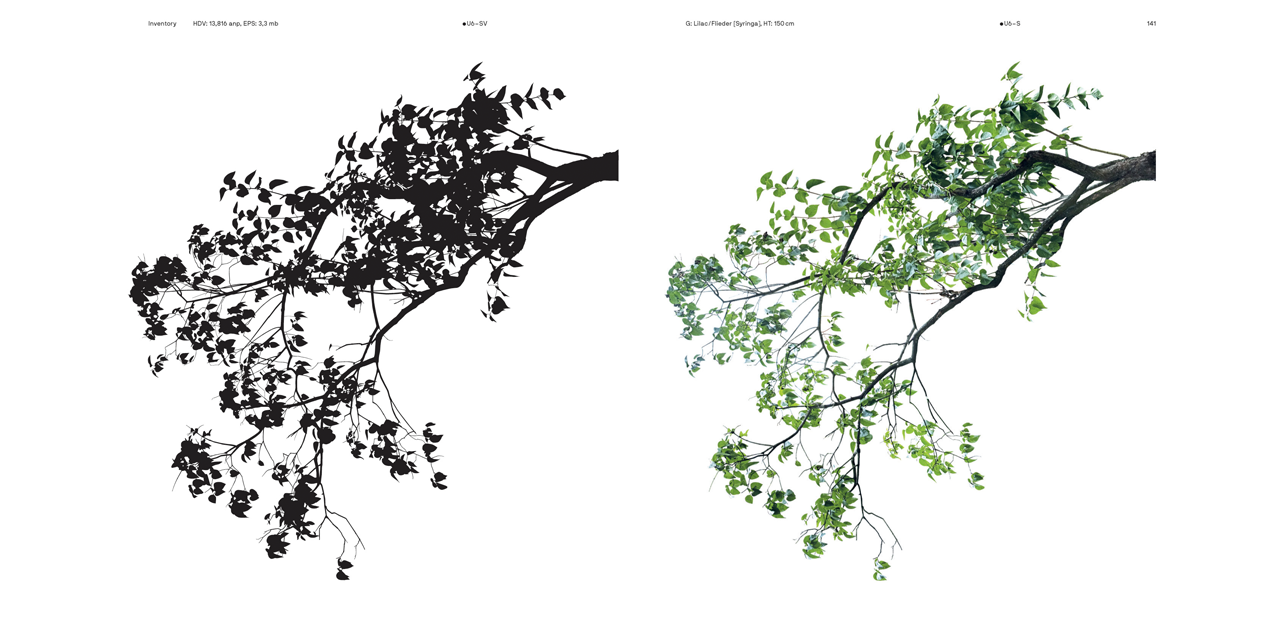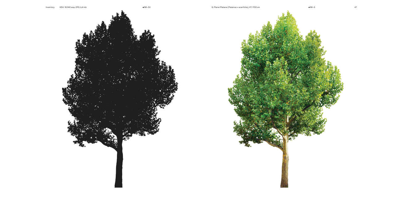From the existing stand-alone tree objects, which can be placed against both dark and light backgrounds of all kinds, Neubau has furthermore derived individual “tree modules”. These modules can be combined with the ready-to-use trees in an endless number of ways. Alongside detailed information about tree species, size, location, year of planting and file format, the catalogue contains also numerous impressive examples of how these images can be used.