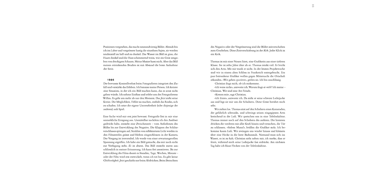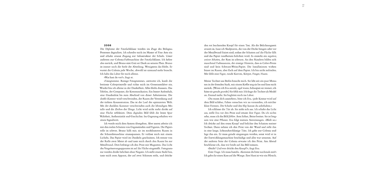 Dem fotografischen Werk steht der autobiographische Text in nichts nach. Eine direkte und unnachgiebige Sprache eröffnet Erdts Welt, in harten und weichen Tönen zeichnet sie ihr persönliches und fotografisches Leben nach, von der Jugend bis in die Gegenwart. Die langsame, sorgfältige Arbeit mit dem Negativ, die Entwicklung im Labor, die Einzigartigkeit und Verletzlichkeit des Materials – ein Teil davon kommt erst in der Sprache zu uns. In dieser Welt ist der Betrachtende nicht Eindringling, sondern Gast, nicht in der Fremde, sondern eigentlich bei sich.
