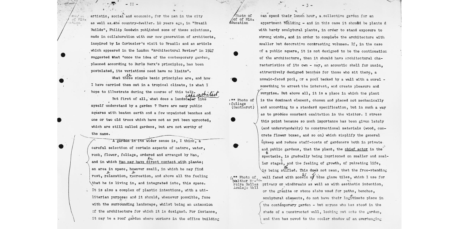 The lectures paint a picture of Burle Marx not just as a gardener, artist and botanist, but as a landscape architect whose ambition was to bring radical change to cities and society. The lectures are framed by photographs, by Leonardo Finotti, of a selection of Burle Marx’s realized projects.