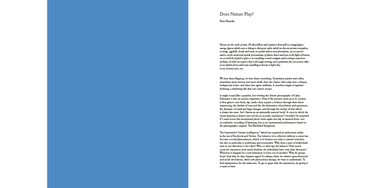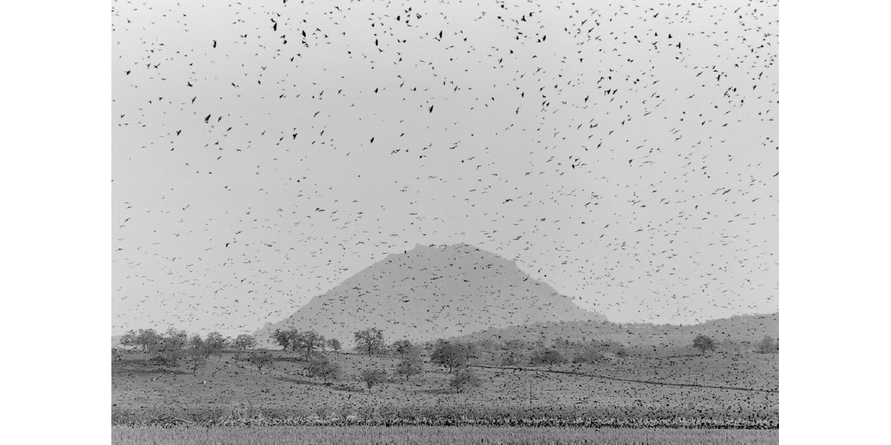 Swarm is a breathtaking photographic series exploring the flock movements of migrating birds. The photographs offer a unique view of the beauty but also the complexity and diversity of shape variations. A swarm sitting on the ground mirrors the surface of the earth like a skin, but as soon as it lifts up it becomes a fluid three-dimensional system in constant flux. This aerial ballet reveals a rhythm of upward explosion and downward, cascading movement. At times the forms seem to explode, blooming like flowers or expanding outward like fireworks. At other times they appear more stable, slowly drifting like a negative image of stellar constellations. Swarm looks up into the sky and follows flight through the dynamic landscape of streams of air.