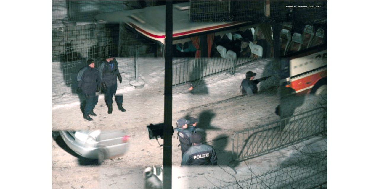 Jules Spinatsch was at the World Economic Forum and also attended the G8 summits at Davos and Evian. But rather than street fighting and handshakes, Jules Spinatsch shows winter nights in Davos, complete with floodlighted barbed wire, containers being used as barricades in Genoa, lonely TV reporters outside broadcast vehicles and sleepy guards in New York. Temporary Discomfort shows people waiting for the big event, which is revealed as meticulously planned down to the last detail.