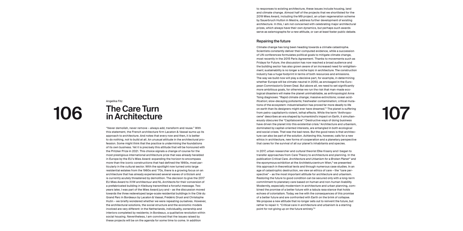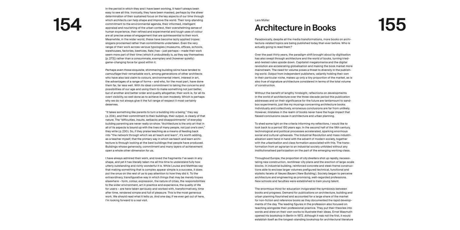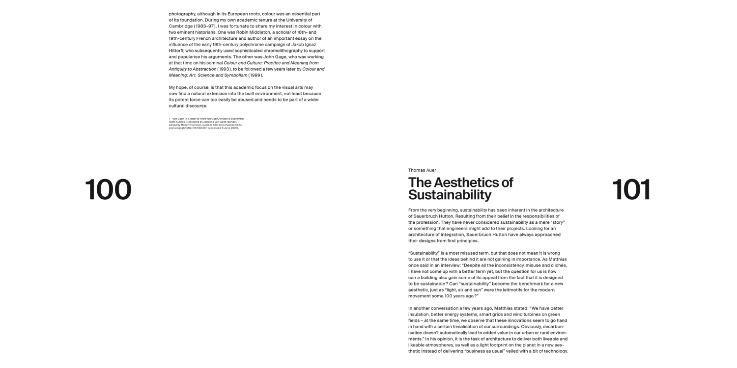 The authors include critics who have written on the work of the practice in the past, architectural colleagues and writers whose opinions and observations are respected by the editors as well as a handful of people who either live or work in one of their buildings and so have experienced Sauerbruch Hutton’s architecture firsthand. A photographic essay by the Finnish artist Ola Kolehmainen augments the twenty-five essays with works created between 1990 and 2020.