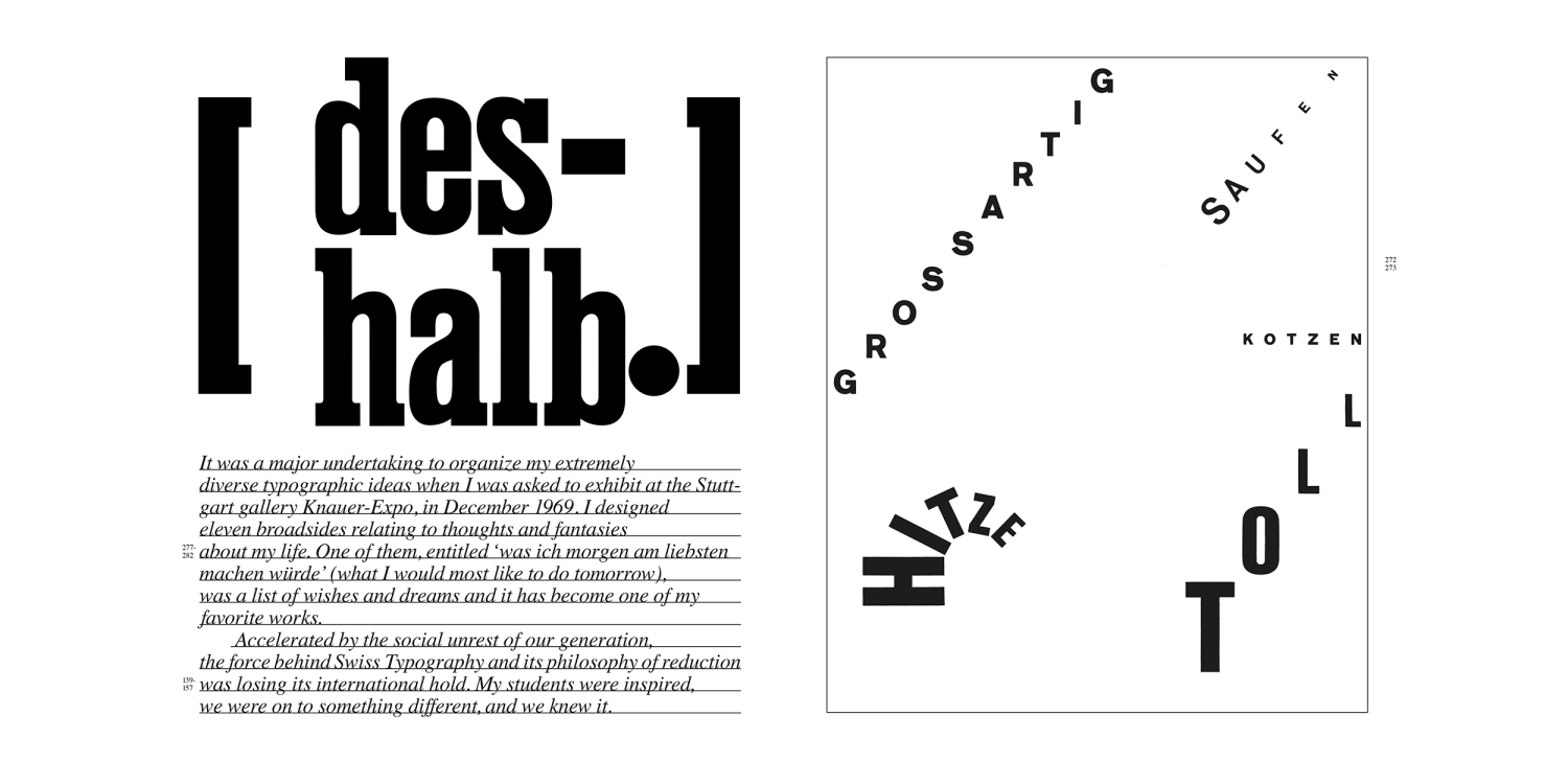 Since the 1970s Wolfgang Weingart has exerted a decisive influence on the international development of typography. In the late 1960s he instilled creativity and a desire for experimentation into the ossified Swiss typographical industry and reflected this renewal in his own work. Countless designers have been inspired by his teaching at the Basle School of Design and by his lectures.