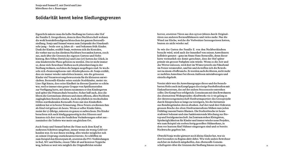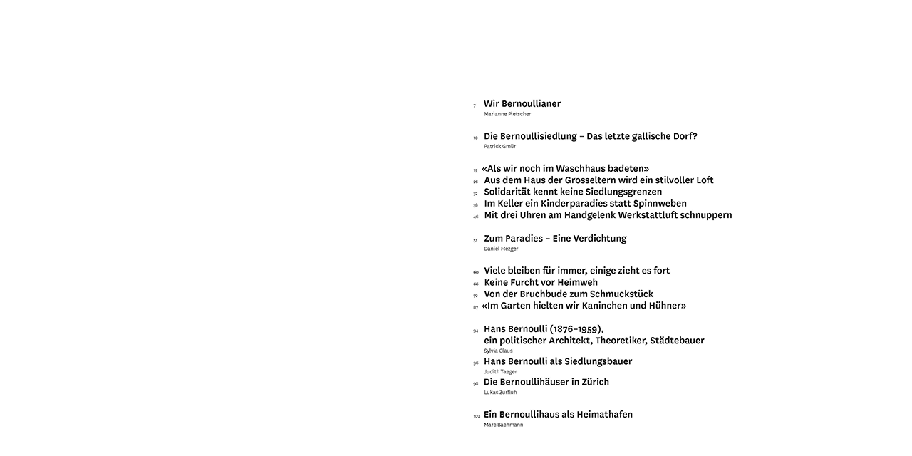 Fotografien von Marc Bachmann und Texte der Dokumentarfilmerin Marianne Pletscher, die selbst Besitzerin eines Bernoullihauses ist, stellen die Menschen in Porträts vor, erzählen deren Geschichte und zeigen das Leben in diesen einmaligen Häusern.