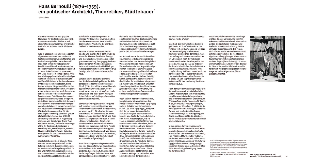 Der Schweizer Architekt Hans Bernoulli baute 1924 und 1928 in zwei Etappen eine Reihenhaussiedlung für die Zürcher Arbeiterschicht. Die kleinen Häuser mit Gärten sollten ein Zuhause für Familien bieten, bezahlbar sein und ein Gefühl von Gemeinschaft erzeugen. Die Innen- und Aussenräume waren ursprünglich, typisch für eine Reihenhaussiedlung, identisch aufgebaut. Doch mit der Zeit und dem Einzug neuer Bewohner veränderten sich die Grundrisse, Wände wurden abgerissen und neu gebaut und jedes Haus nach Belieben individualisiert.