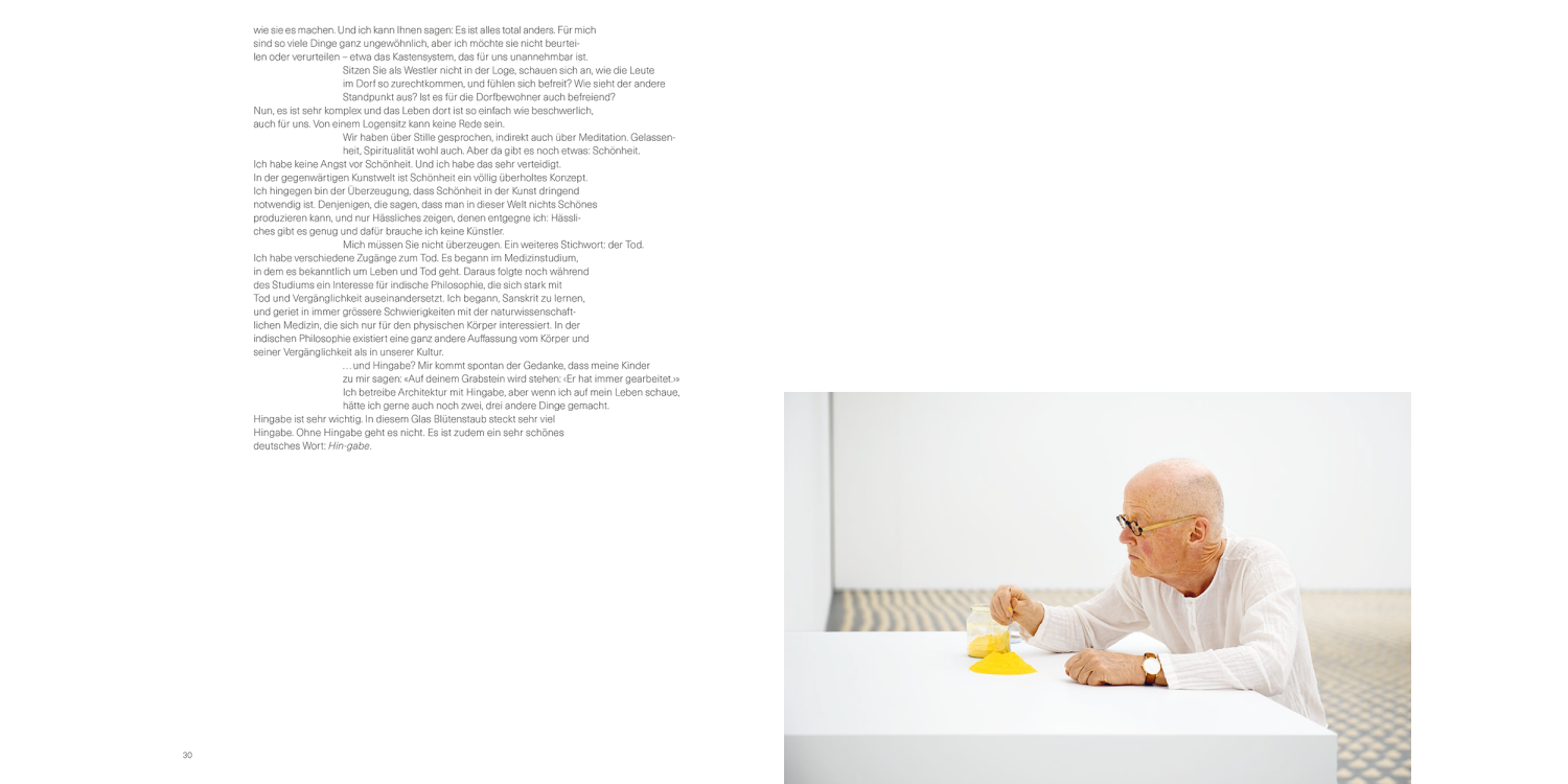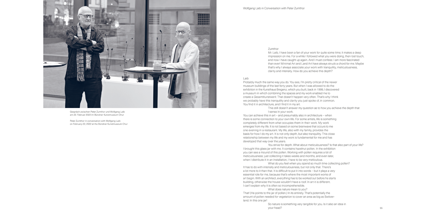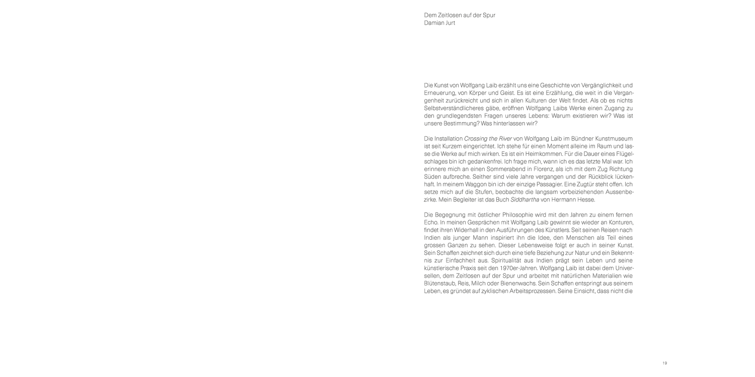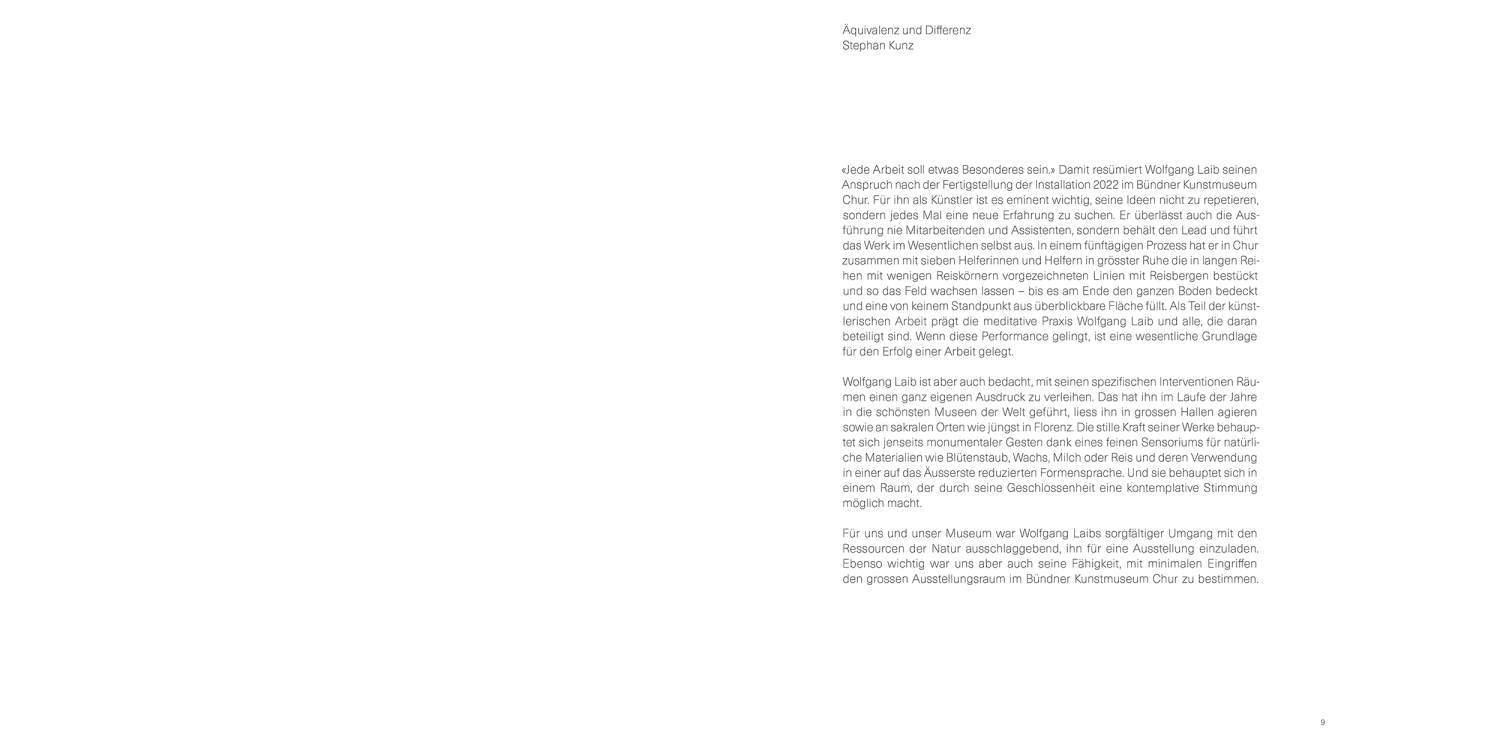 At Bündner Kunstmuseum, Laib realized a large room-sized installation made of thousands of rice mountains. As an important staple food, rice symbolizes vitality and is fundamental for our earthly existence. The process of creating this work of art is revealed in the book and is related to a conversation between Wolfgang Laib and the architect Peter Zumthor. With this book, Wolfgang Laib reveals the spiritual dimension of art and leads us directly to the sources of his poetics.