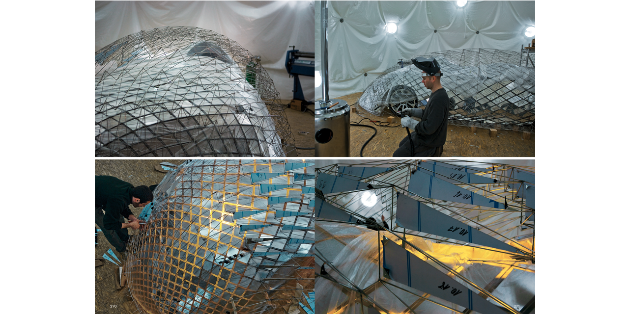 As part of its BMW H2R research project, Studio Olafur Eliasson is preparing a dense publication comprising extensive visual material; excerpts from two seminars held in 2006/2007; and conversations between Olafur Eliasson and a number of distinguished artists and thinkers. In the research project, Eliasson raises questions of formgiving and materiality, mobility, temporality, movement, and renewable energy. In 2005 a BMW H2R hydrogen-powered vehicle was delivered to Studio Olafur Eliasson and then stripped bare of its outer shell. To create a new skin several form studies have been carried out in a temporary geodesic dome, constructed in the yard of the studio. The final surface of the car consists of layers of ice, frozen around two intricate nets, mirrored plates and light. The “Climate car” can only exist in a microclimate with a temperature of minus 6 degrees Celsius or below.